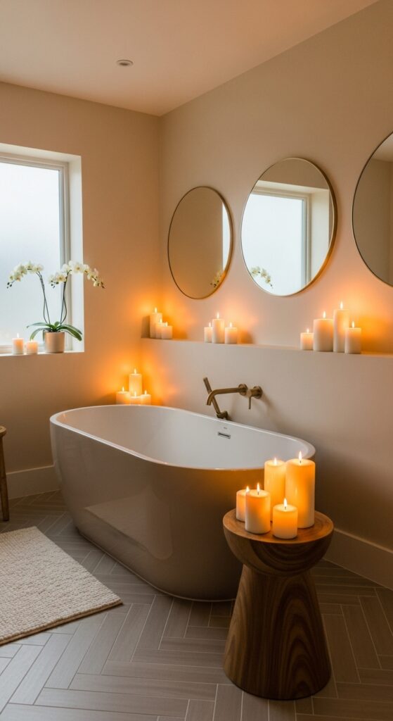 12. Relaxing Beige Bathroom Ideas with Candles and Mirrors