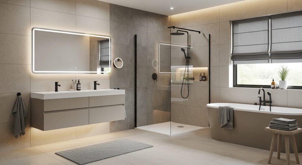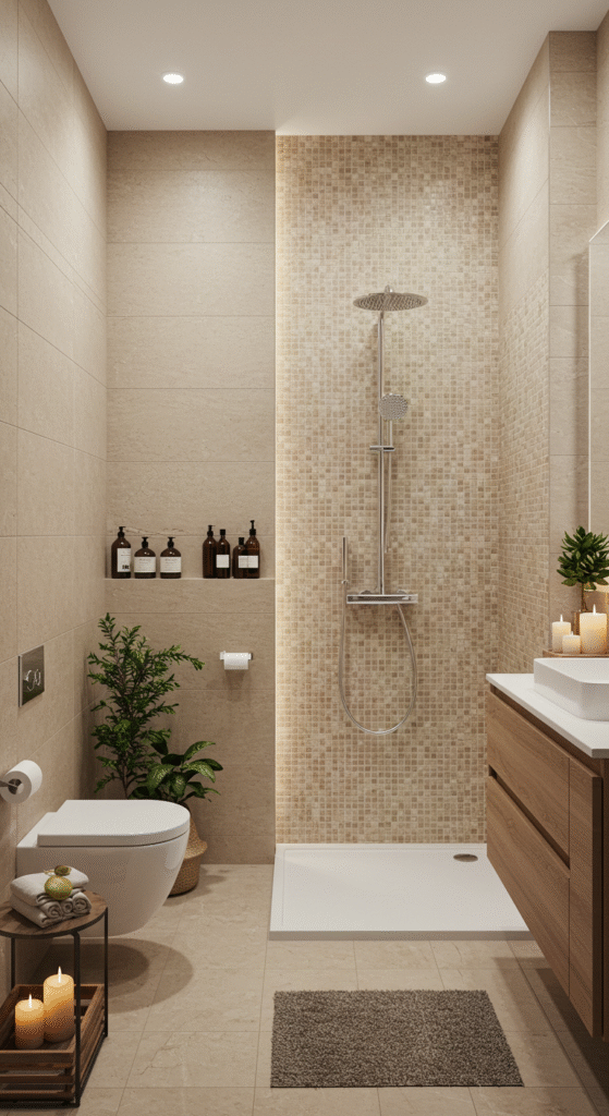 Beige ceramic tiles add sophistication while staying practical for humid spaces.