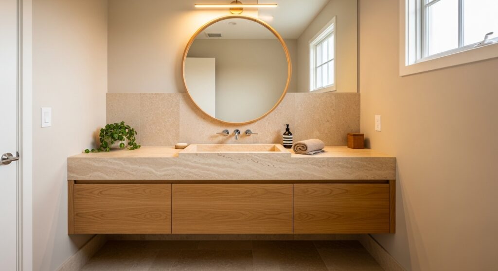 Opt for oak, teak, or walnut vanities that complement beige tiles or walls.