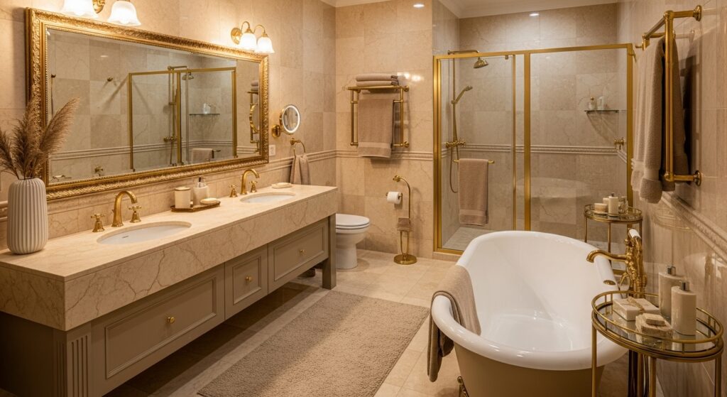 Think gold taps, mirrors, handles, and towel bars that glimmer against soft beige.