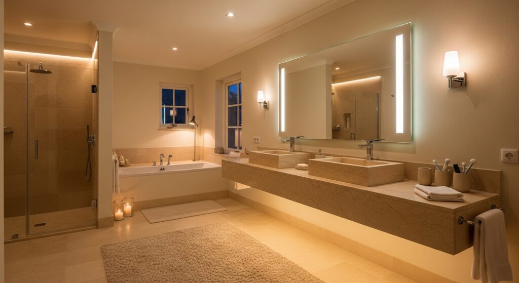 Use ceiling lights, sconces, and LED mirror strips to layer brightness effectively.