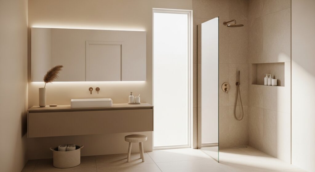 Warm white bulbs highlight the beige undertones, enhancing a cozy, spa-like mood.