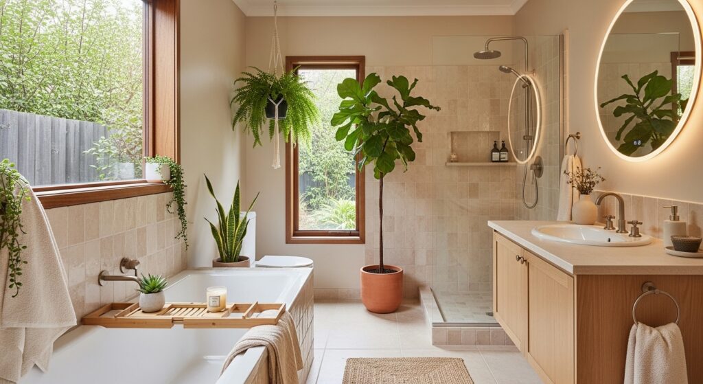 9. Greenery-Focused Beige Bathroom Ideas with Indoor Plants