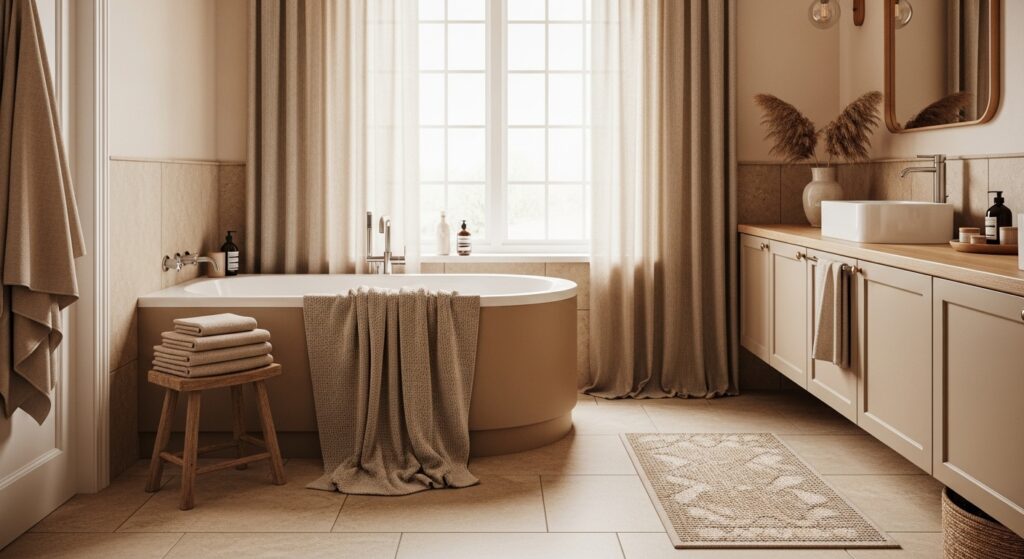 11. Cozy Beige Bathroom Ideas with Soft Fabric Accents