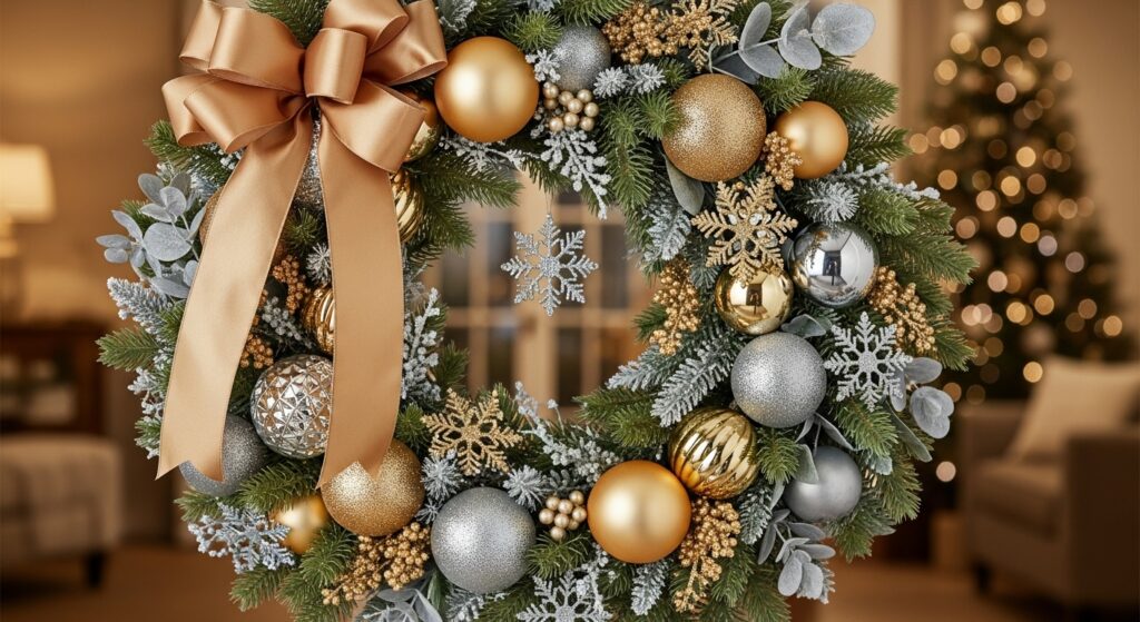 Use metallic ribbons, shiny baubles, and frosted leaves to create a wreath that sparkles beautifully under soft lighting.