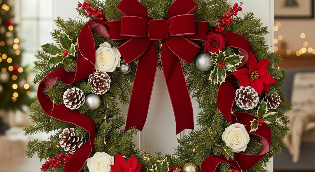 Floral And Ribbon Christmas Wreath Decorating Ideas