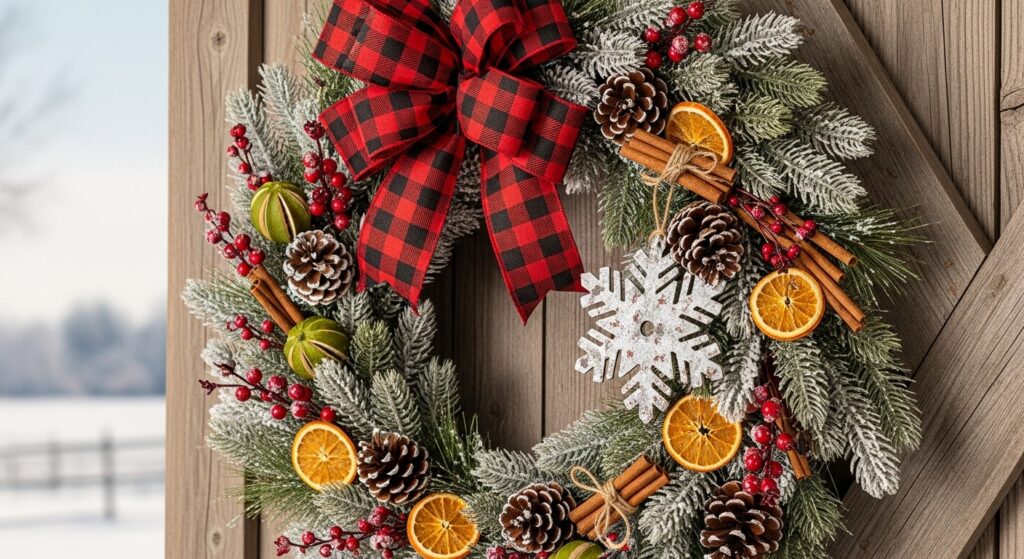 Use burlap ribbons, wooden stars, cinnamon sticks, and plaid bows to give your wreath a cozy farmhouse feel.