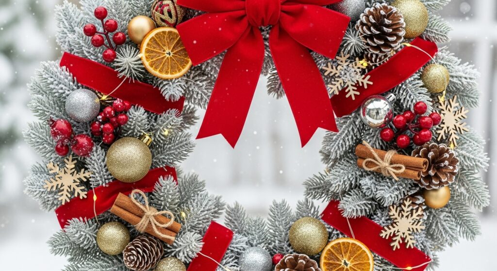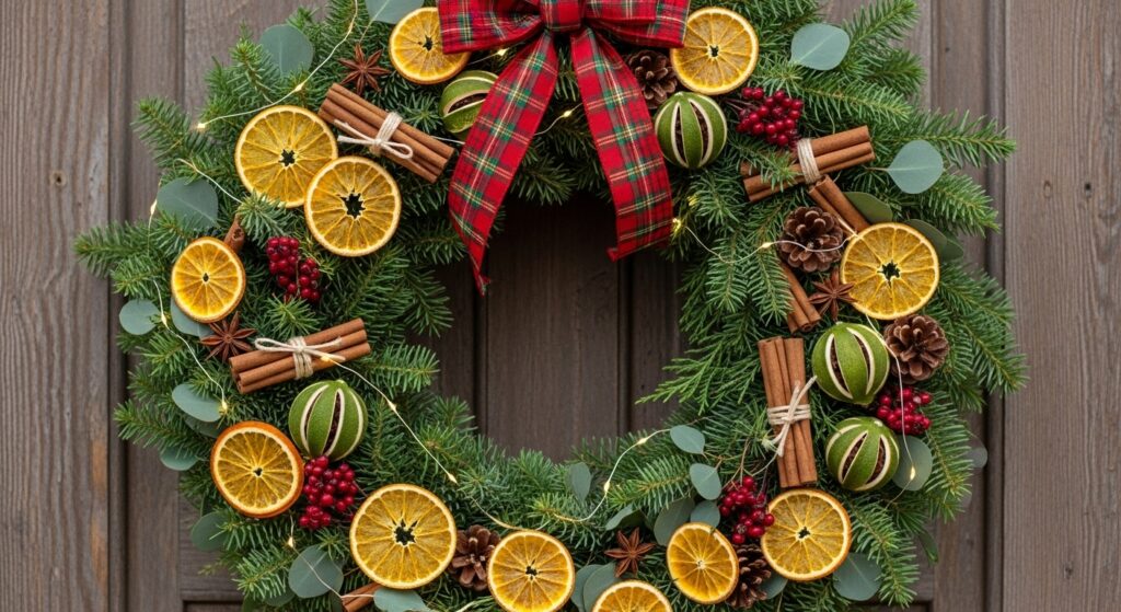Use dried orange slices, cinnamon sticks, and star anise for a natural, fragrant wreath that fills your home with festive warmth.