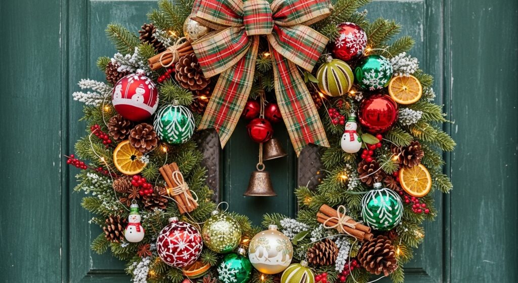 Add retro ornaments, classic red ribbons, and antique-style bells to give your wreath a timeless look.