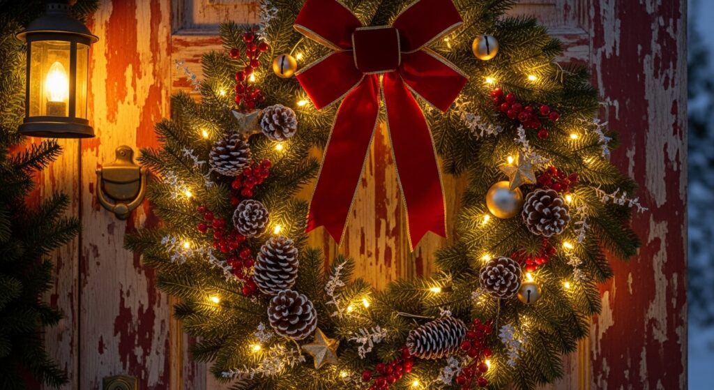 You can easily customize this style by adding fairy lights or gold ornaments for a cozy evening glow. It’s simple, affordable, and perfect for any door or wall display.