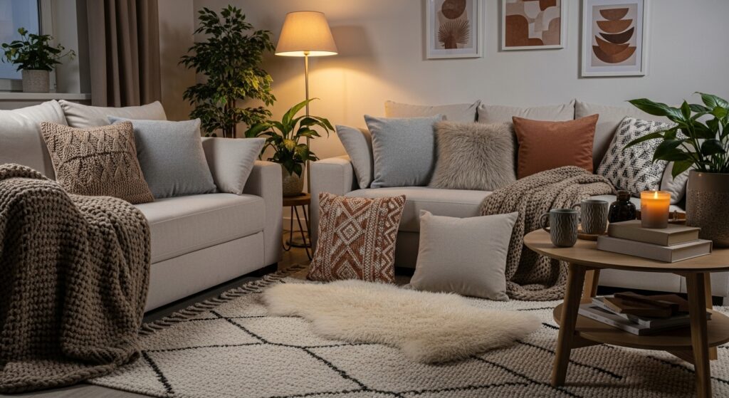 The secret to a cozy living room lies in layering. Combine different fabrics like knits, faux fur, and cotton to add depth and comfort.