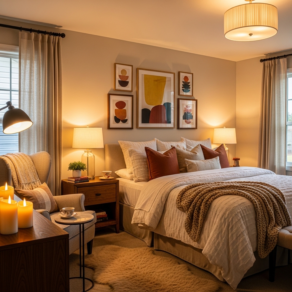 A cozy master bedroom appeals to all senses—not just sight. Use scented candles, diffusers, or essential oils to fill your room with calming aromas.