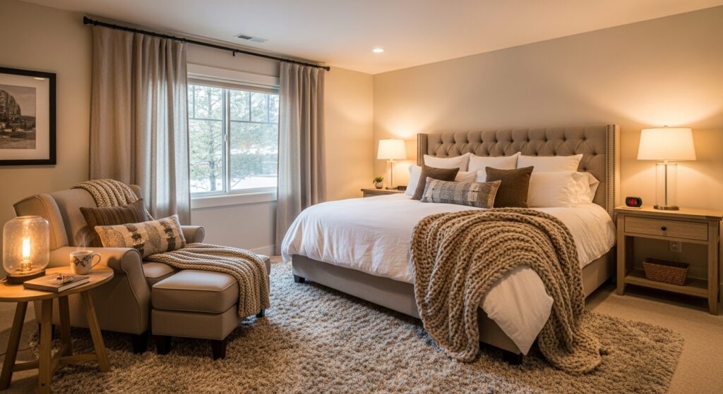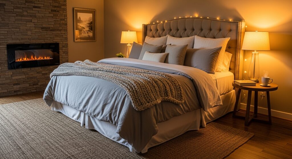 A plush comforter, soft throw blankets, textured pillows, and warm-toned lamps are essential for a truly cozy master bedroom setup.