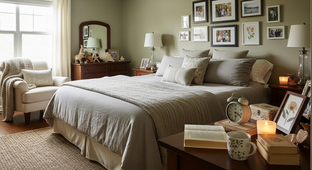 Even a small shelf with cherished keepsakes or a wall collage can bring emotional comfort and connection to your room.